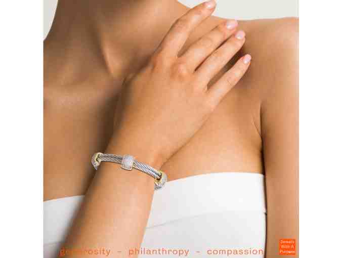 Add glamour to your day with this flattering stackable bracelet. Once you own it, it will sure become your “go-to” piece! Hypoallergenic, stainless cable with rhodium and yellow gold overlay. Three zirconia crystals micro-pavé stations and magnet closure. Standard size to fit most wrists. Outstanding packaging for gifting, storing or for travel. Created exclusively for the nonprofit community!