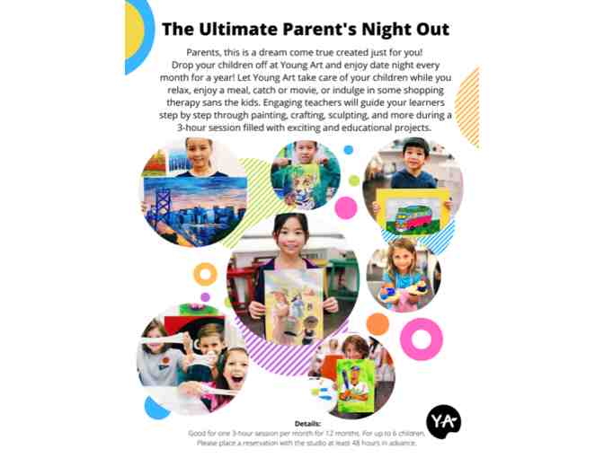 Parents, this is a dream come true created just for you! Drop your children off at Young Art and enjoy date night every month for a year! Let Young Art take care of your children while you relax, enjoy a meal, catch a movie, or indulge in some shopping therapy sans the kids. Engaging teachers will guide your learners step by step through painting, crafting, sculpting, and more during a 3-hour session filled with exciting and educational projects.