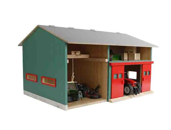 Every farm needs a workshop in order to repair and maintain the farm tractors and implements. This workshop in wood with a 1:32 scale, has two separate units with storage above workshop area, red dual sliding doors and the roof can open for easy access. Dimensions: 16.1"L x 21.3"w x 12.6"H