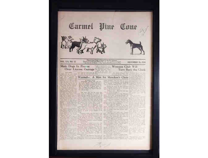 The Carmel Pine Cone Newspaper Dec 26, 1930 framed in an easily accessible 13 x 19 black frame, so item can be removed and read.
