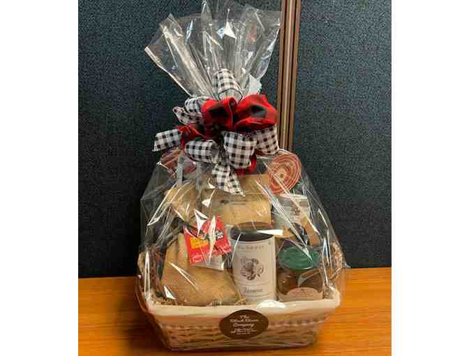 This basket includes: 14oz Ground BLack Bison Coffee, Oliver Puff Jasmine Tea, Apple Jalapeno Jam, Fruit and dip mix, Lavender Coco Mix, Island Bamboo Pakka Spoons, Cheese Enchilada soup mix, Bourbon Barrel Meat Seasonings, Chaco valley local honey!