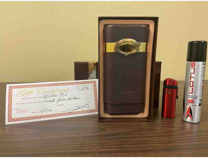 $25 Winston PLE gift card, leather cigar case, and a butane cigar lighter with fuel