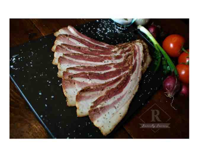 Experience a variety of the finest Berkshire bacon from a Kansas pork producer, R Family Farms! Their customers rave about the quality, flavor, and meaty-ness of the bacon, calling them "Second to none!". This collection includes 7 pounds of their best selling bacons: Hickory Smoked Bacon, Peppered Bacon (pictured), Hickory Smoked Jowl Bacon, English Back Bacon, Pork-y Bacon, and Bacon Ends!
