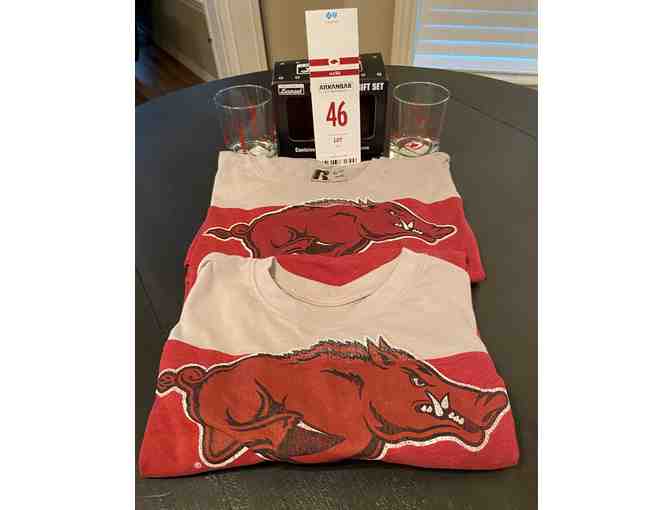 This item donated by Fitzhugh POS Solutions includes 4 tickets to the Razorback/LSU basketball game on March 2, 2022, Level L, Row 7, Seats 5-8, a parking pass, two Razorback T Shirts, and two Razorback glass tumblers. The tickets are electronic and will be forwarded to the bid winner