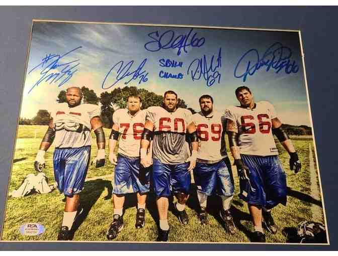 Awesome 16 x 20 signed framed photo of perhaps the best offensive line in NY Giants team history, The Big Blue Wall helped deliver Super Bowl 42. This great photo is signed by