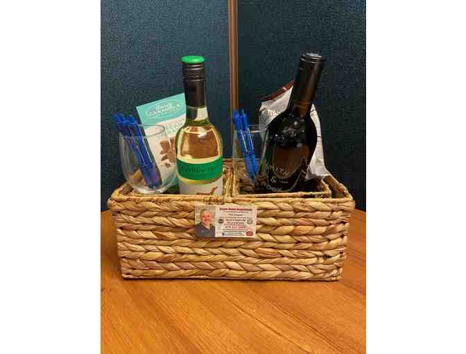 Basket Contains One bottle of Pinot Grigio, one bottle of Cabernet Sauvignon, two wine glasses, two bags of premium chocolates, one medium sized and two small square wicker baskets.