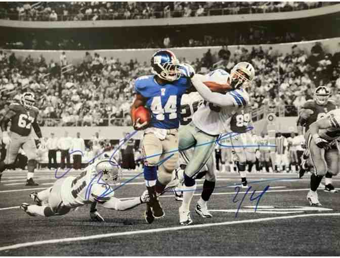 NY Giants Super Bowl 46 RB Ahmad Bradshaw Autographed Framed 16 x 20 Photo. signed by Bradshaw this beautful photo empitomizes the hard nosed player #44 was for the GMen, laying a stiff arm on the Cowgirls DB in a Giants win.
