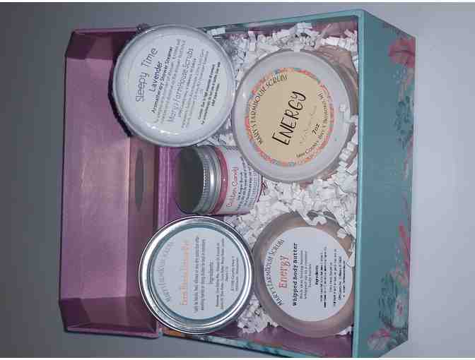 Treat yourself to some small batch, hand crafted skin care products using high quality, skin loving ingredients! Gift box includes: ÂÂSleepy Time Lavender Aromatherapy Shower Steamer ÂÂEnergy Whipped Body Butter ÂÂEnergy Body Sugar Scrub ÂÂFarm Hands Lotion Bar ÂÂCotton Candy Sugar Lip Scrub