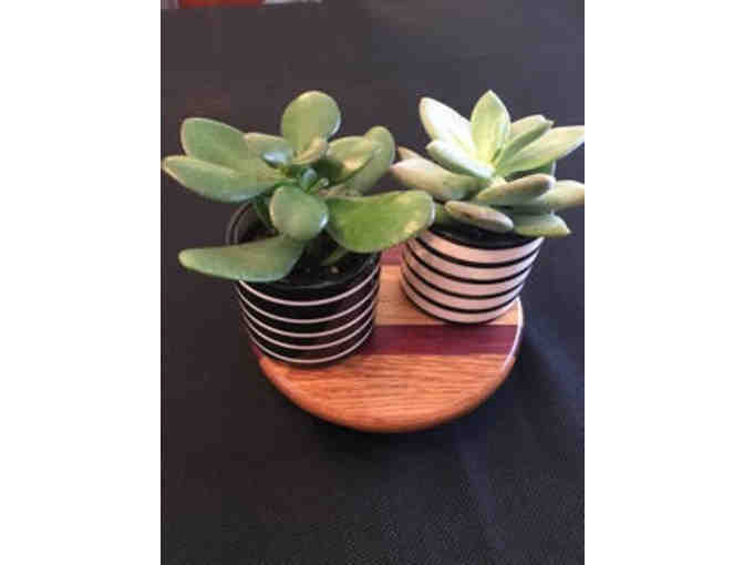 Enjoy this beautifully arranged bundle of succulent plants, black and white succulent pots, and handcrafted wooden lazy susan made by John Waltrip.