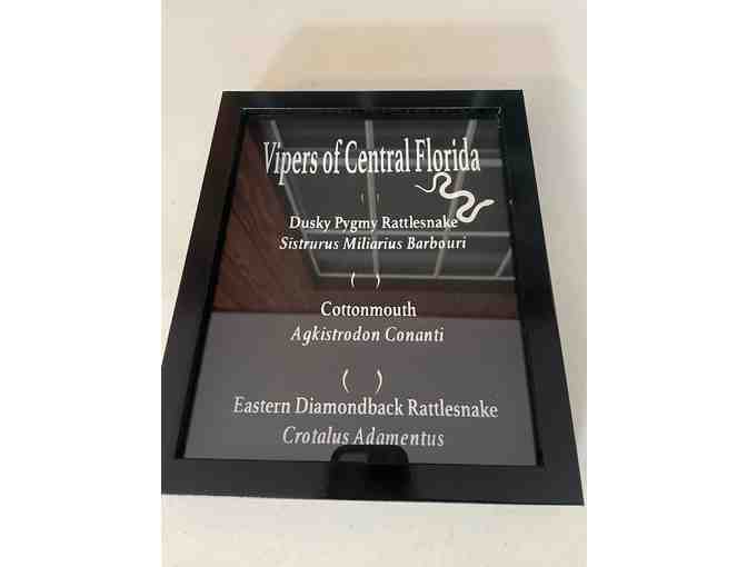 You can display the fangs from all three vipers native to Central Florida: the Eastern Diamondback Rattlesnake, the Florida Cottonmouth, and the Dusky Pygmy Rattlesnake. See the difference in size and shape between these three amazing snakes! This piece of art is truly a conversation starter and will be perfect for the snake lover in your life!