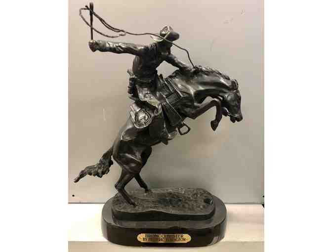"Bronco Buster" was one of the first of Remington's works that took advantage of the "Lost Wax" process, completed in 1885. This statue is reproduced in solid bronze, cast in a brown patina and then hand-rubbed to bring out detail and highlights. The statue is then mounted on a marble base with an etched brass plate.