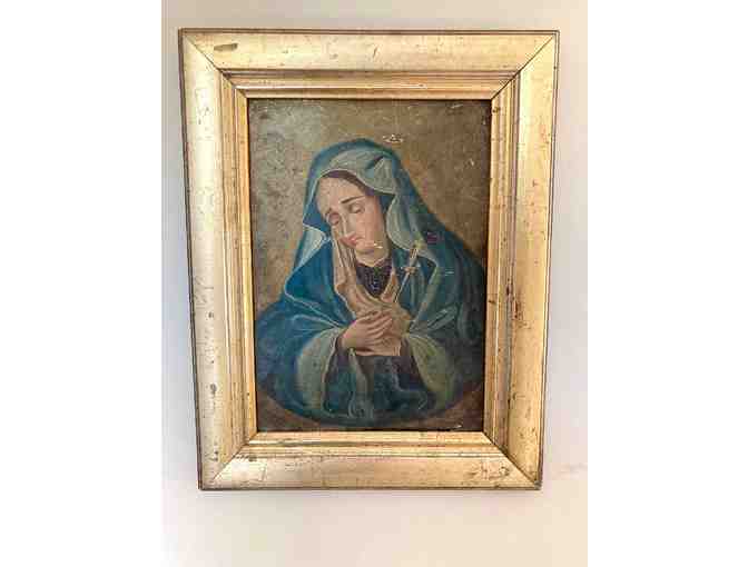 Painting of the Mater Dolorosa. Framed, painted on metal. Probably Hispanic America, 18th to 19th century. 14x18 inches.