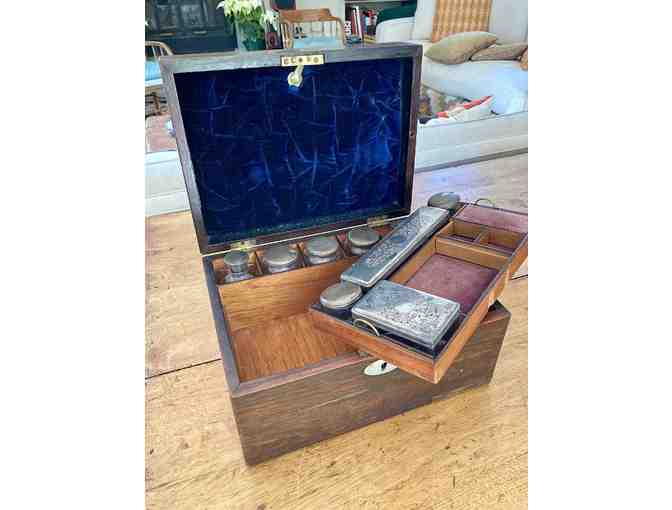 Victorian era antique vanity box. Made of wood and velvet-lined on the inside. 12x9x7 inches. Various glass containers inside. Small drawer opens on lower right side (not shown). The central tray lifts out with storage underneath. A pocket is hidden on the inside of the lid.