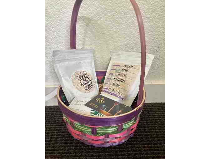 This sweet little basket contains two small packages of coffee beans from Cute Coffee, roasters from the East Bay. And a $20 Peet's gift card and a $4 Starbucks card. Get caffeinated!