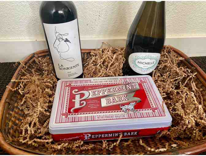 A basket of 2018 La Sonriente Garnacha Spanish Red Wine, Michelle Brut Champagne, and a tin of Williams Sonoma Peppermint Bark. How's that for a winning combination? Donated by SFBC Parents past and present.