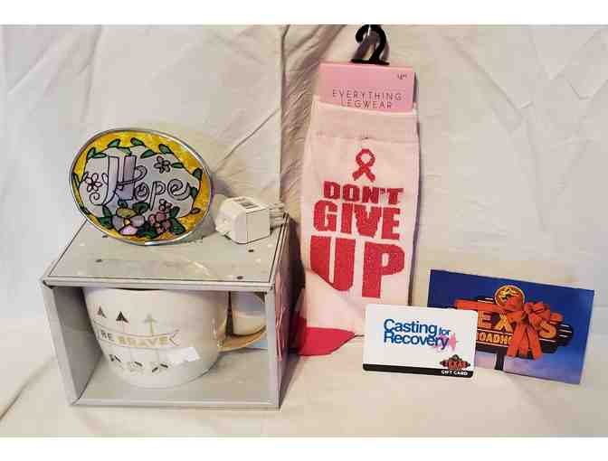One be brave mug with gold lettering and pastel accent arrows, One pair of Don't give up pink socks (Shoe size 4-10), One stained glass Hope nightlight and one Gift Card to Texas Roadhouse. http://www.texasroadhouse.com/
