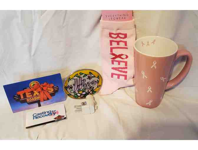 One Pink ribbon mug, one stained glass hope nightlight, one pair don't give up socks (size 4-10) and a gift card for Texas Roadhouse. www.texasroadhouse.com