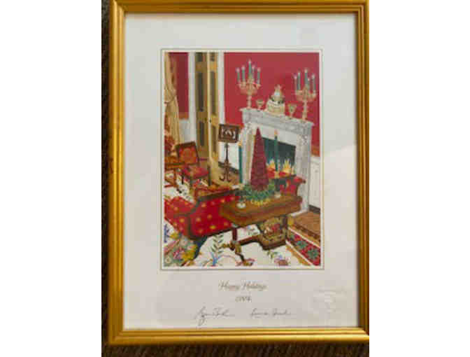 Framed 2004 Happy Holiday image handsigned by President George W. Bush and Laura Bush and including the Presidential seal.
