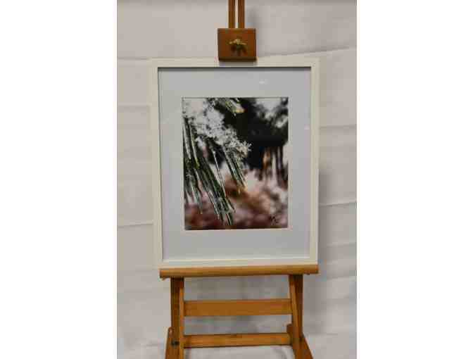 Enjoy this framed magnified snowflake to hang in your home! White frame photo frost & pine needles.