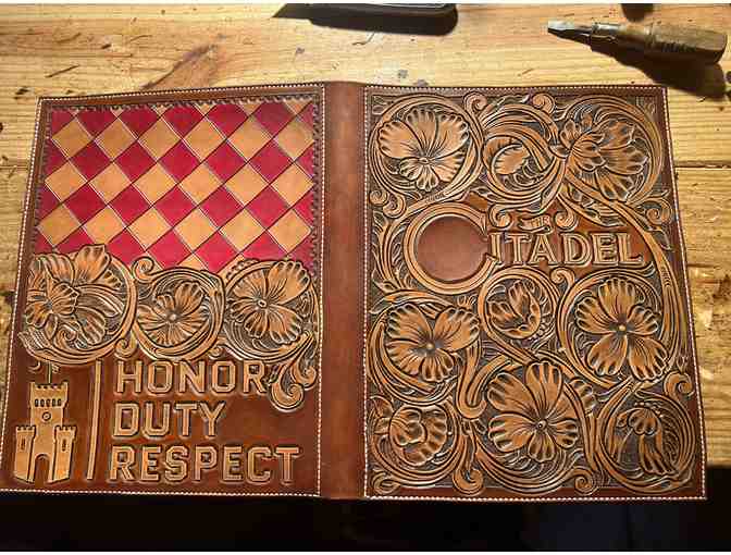 One-of-a-kind custom hand tooled The Citadel branded leather notebook from Cattle Company Leather!