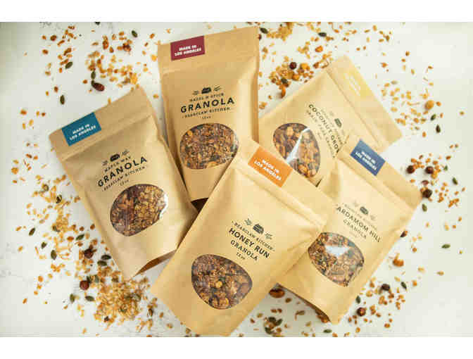 A sample of five scrumptious homemade LA granolas: Honey Run, Maple Way, Hazel & Spice, Coconut Grove, and Cardamom Hill Founded by a pastry chef with a big appetite, Bearclaw Kitchen creates granola and snacks to fuel a full life. We roast whole nuts and organic oats with high-quality ingredients like unfiltered wildflower honey and organic single-origin maple syrup to make our signature addictive flavors. We are a female-powered small business based in Los Angeles, and we deeply value our customers and the community that has grown around our granola.