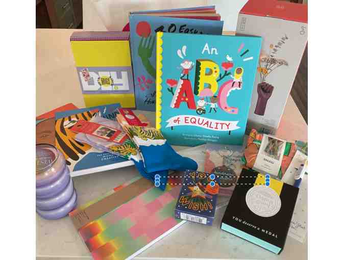 Girl (black) Power Vase $40 Realm (purple) glass bubble candle $30 You Deserve a Medal (Damn Good) Pin $18 Zucchinis Reusable Standard Baggu $12 Cucumbers Reusable Baby Baggu $10 Who Was Martin Luther King, Jr? board book $7.99 Who Was Ruth Bader Ginsburg? board book $7.99 Find Your Artistic Voice book $18.95 Graphics dotted Notebook $12 5 Pom Pom Crafts in a Box $30 Kindness Matters Enamel Keychain $16 Tropical Enamel Charms Necklace $16 You Wish! Magical Creatures (3 card games in 1) $14 30 Easy Ways to Join the Food Revolution Cookbook $19.95 An ABC of Equality book $16.99 Year of the Tiger Mens Socks $12.50 Year of the Tiger Women Socks $12.50 Happy Books 7 Year Pen $10
