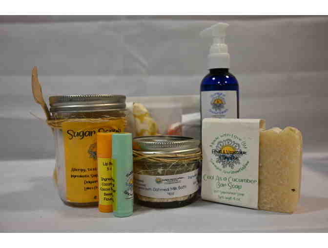 Enjoy this spa basket from Sunlight & Snowflakes. Basket includes three differently scented soaps, two chapsticks, sugar scrub, oatmilk bath (good for eczema and acne), handsoap, and shower fizz.