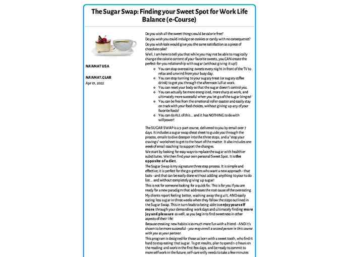 The Sugar Swap e-course: Finding your Sweet Spot for Work Life Balance (e-Course) By Alegra Loewenstein, Author of Emotional Eating Detox. Do you need help controlling your sweet tooth? This e-course can help you figure out a plan. Redeem by June 14, 2022.