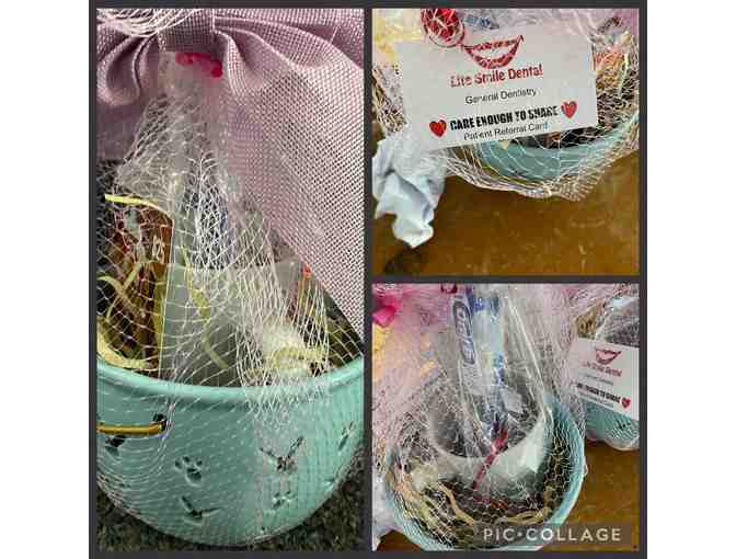 An assortement of dental hygiene products, including an Oral -B toothbrush in a cute ceramic mug. Topped off with a gift card to Lucille's Bar-B-Que