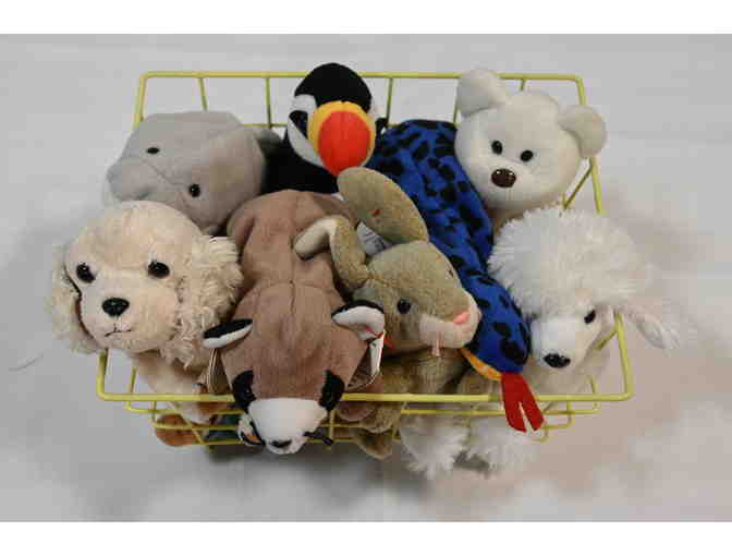 This vintage Beanie Babies basket would be a perfect gift for a collector, child, or to give into some childhood nostalgia. Comes with 10 different Beanie Babies: Lizard, Pterodactyl, Puffin, Poodle, Dog, Bunny, Dolphin, Blue Bird, Bear, Raccoon. Some beanies are rare and worth more ($10-$200 each).