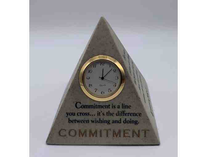 This paperweight displays the Pyramid of Change with Commitment, Effort, Change, and Challenges on each side. There is a quote with every word. There is a clock on the commitment side that has never been used. The plastic is around to stem to lock it. It's Made of Stone and fairly heavy. It stands a little over 4" tall.