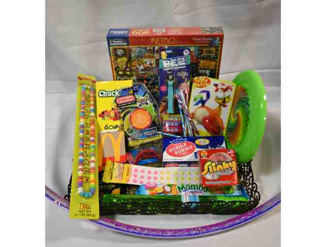 50s Basket created by 8th grade TAG! Includes silly putty, pez dispenser, 500 piece puzzle, yo-yo, frisbee, double bubble gum, slinky, $20 gift card to McDonalds, bubbles, purple hula hoop, candy buttons, mamba tropics fruit chews, pop rocks, pixie sticks, chuckels candy, candy necklace, and candy lips.