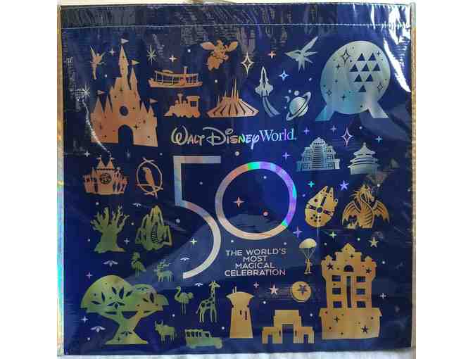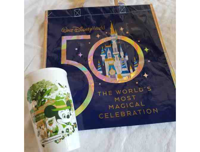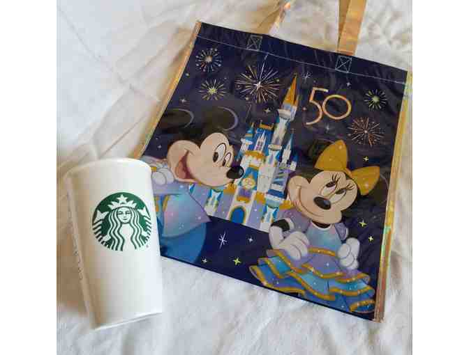 Large and Medium 50th Anniversary reusable shopping bags, Minnie Mouse Apple earbud holder, Collectable Animal Kingdom Starbucks travel cup
