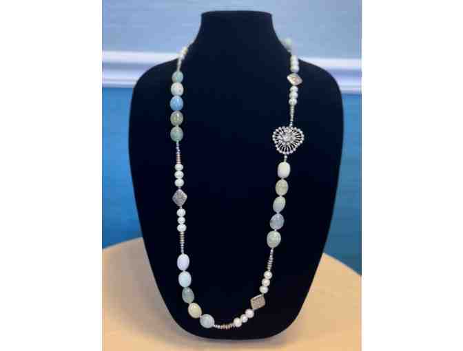 This gorgeous piece is made with a reclaimed antique brooch, silver plate, freshwater pearls, semi-precious stones and crystals.