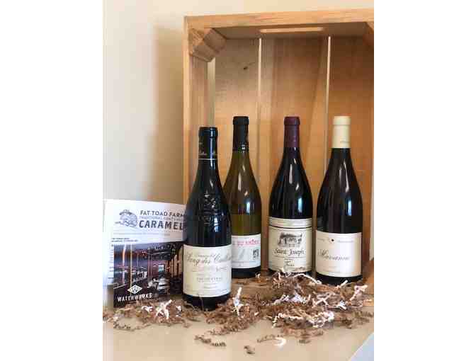There is so much great wine in France's Rhône Valley it's hard to cover them all, but we'll certainly try. The Northern Rhône is typically known for their deep Syrah and rich Marsanne. We picked some killer Syrah by Lionel Faury and some Cecillon Marsanne to represent that area, and we think they do a pretty great job. As for the south, which is typically known for their blends, we included a very special bottle by Sang des Cailloux that has a gorgeous blend of Grenache, Syrah, Mourvedre, and Cinsault. We also threw in a Cotes Du Rhone blanc by Vignerons Ardechois as a nice example of the white blends from the south. Enjoy with your next steak! Included with this wine is a $25 gift card to Waterworks Food & Drink, as well as a caramel apple kit and a drinking chocolate kit gift box from Fat Toad Farm.