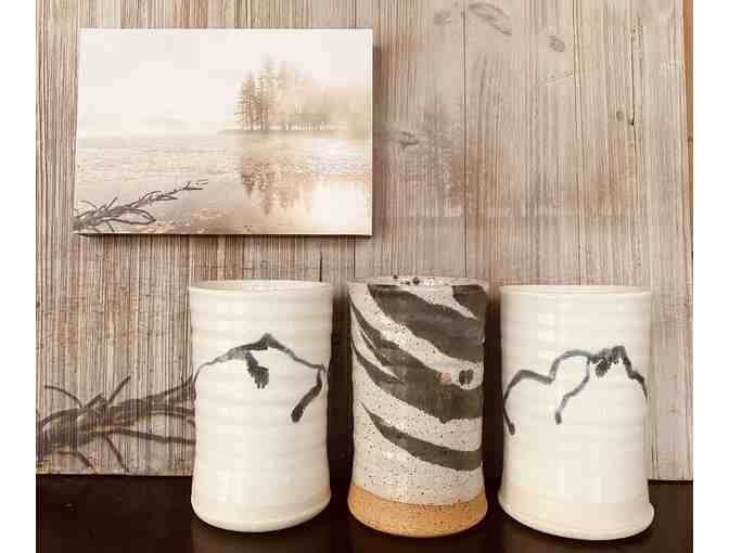 Three beautiful stemless mugs hinting at mountain and green scenery.