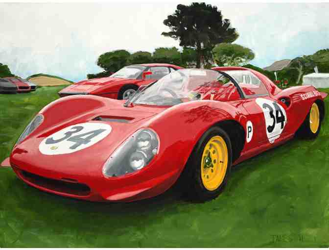 This is a limted edition (1 of 10) hand embellished full size reporduction of one local artist (and Las Lomitas Parent), James Caldwell's favorite paintings. It features a 1966 Ferrari 206 S racing Dino. The unframed dimensions are 30X40inch.