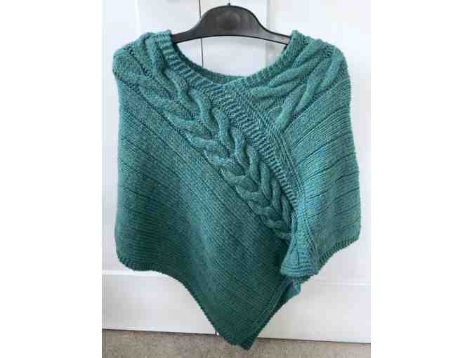 Hand knitted poncho - heather green 100% wool. Features a mirrored cable design which creates an elegant arrowhead pattern. Size - medium