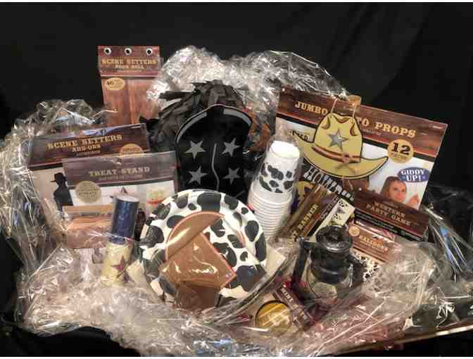 Your western themed party is in the bag with this package.  Includes a horse piñata, plates, napkins, cups, yard sign, balloons, cupcake stand, door decoration, scene setters, wood lantern, boot cut outs, jumbo photo props, table runner, western games, and more!