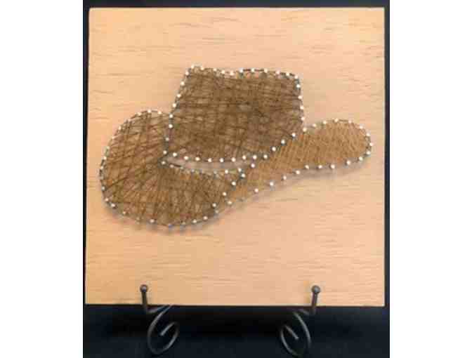 2" x 12" artwork. Medium in wood board, paint, and nail string