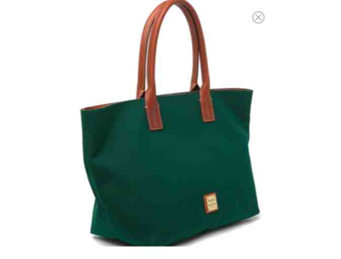 Up for bid, a Dooney and Bourke hunter green tote bag. A sleek option for any destination, this bag has an open top with a magnetic closure and dual top rolled leather handles. The exterior features lustrous hunter green fabric construction with leather trim, embossed metal logo; interior features 3 slip pockets, 1 zip pocket, and attached keychain strap. Bag measures approximately 12"Hx20"Wx7"D, with approximately 7" handle drop.