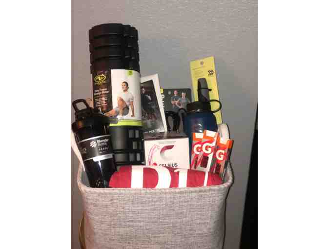 D1 basket includes1 D1 training certificate for 1 free private class and 1 month of free membership, D1 training shirt, foam roller, massage stick, blender bottle, 4 pack of Celsius, 3 packs of Gatorade energy chews, jump rope, SAC engraved water bottle.