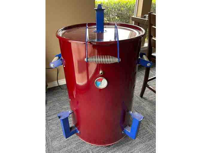 The drum has two front in-let dampers and a top out-let exhaust, thermometer, external probe mount, side handles and dolly style wheels for easy movement. The drum also has a 12"x12" fire basket, diffuser and 22" grill grate is Powder Coated as well.