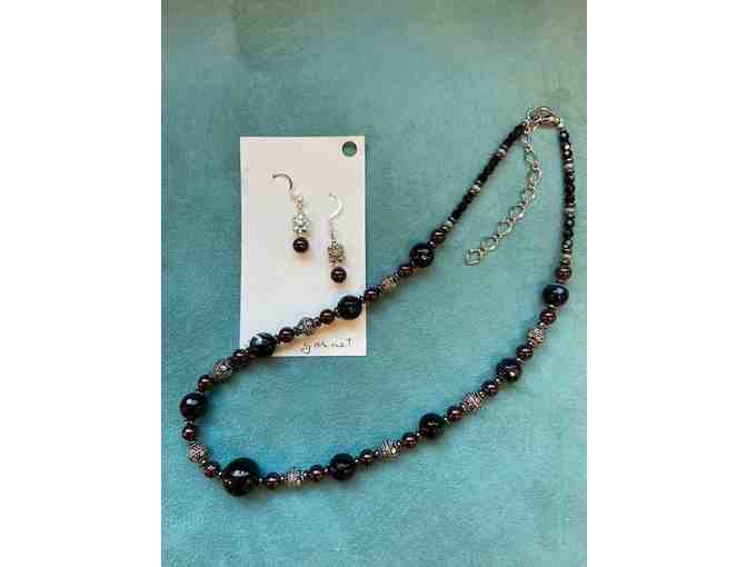 Garnet, Czech glass, obsidian hematite and black agate necklace and earring set.