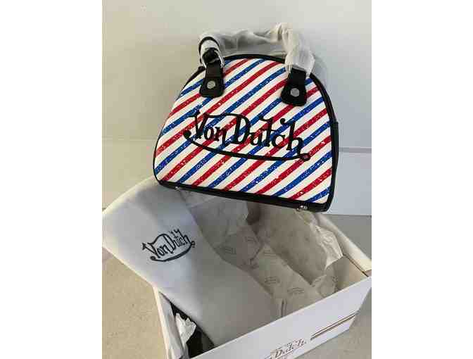 Von Dutch retro Barber Shop Stripe printed mini bowling bag. In box with branded dustbag, comes with detachable strap. Super hip brand revived in California.