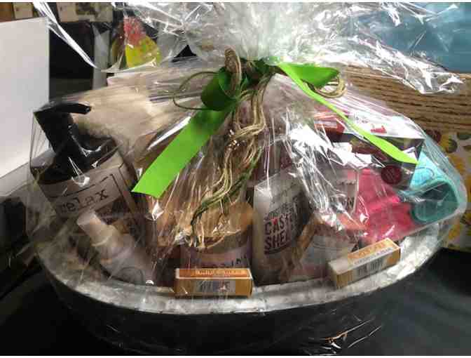This package includes a bath tub container, bath bombs, facial mister, bath salts, shower gel, gel facial masks, candle, fuzzy slipper socks, Burts Bees Chapsticks, hand cream, body lotion, glass wand cold therapy, makeup remover cloths, color street nails, white glo professional tooth paste and charcoal flossers.