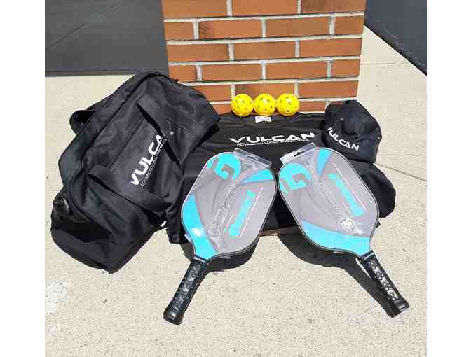 Includes: 2 Gamma Quest Pickleball Paddles, 1 Mens XL Vulcan shirt, Vulcan Duffle bag, Vulcan hat, and 3 Onix indoor pickleballs