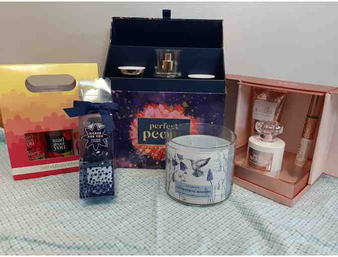 Includes: Mad About You boxed gift set with travel sized body lotion, shower gel, and fragrance mist; Perfect Peony boxed gift set with full size body lotion, shower gel, and fragrance mist; Pure Wonder body gift set with perfume spray, perfume bottle, and small body cream; Fresh Spring Morning 3-wick candle; and Gingham travel sized hand cream and pocketbak hand sanitizer
