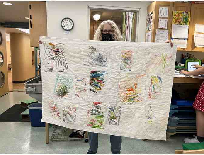 This quilt features drawings by each child in the Garden Room with every students name hand sewn on the back of their square.