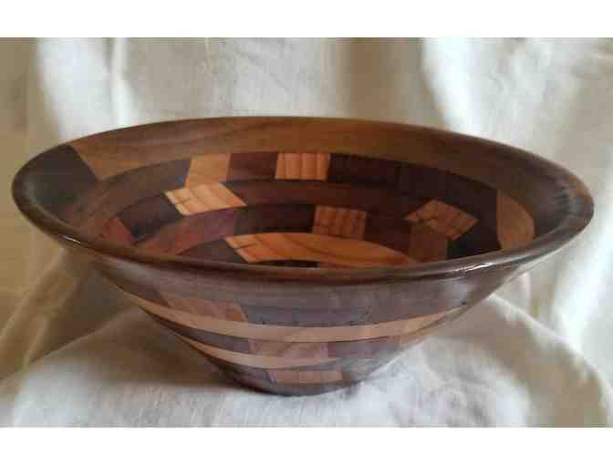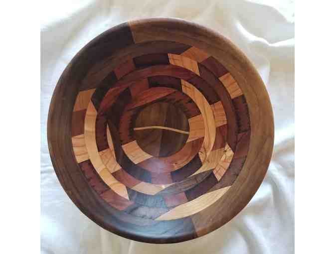 One of a kind Hand-made wooden bowl. This piece of art was created by Grant Francis, beloved retired Woodshop/Stage Crew VHS teacher. The bowl comes with care intructions. Approximately 10 inches wide.